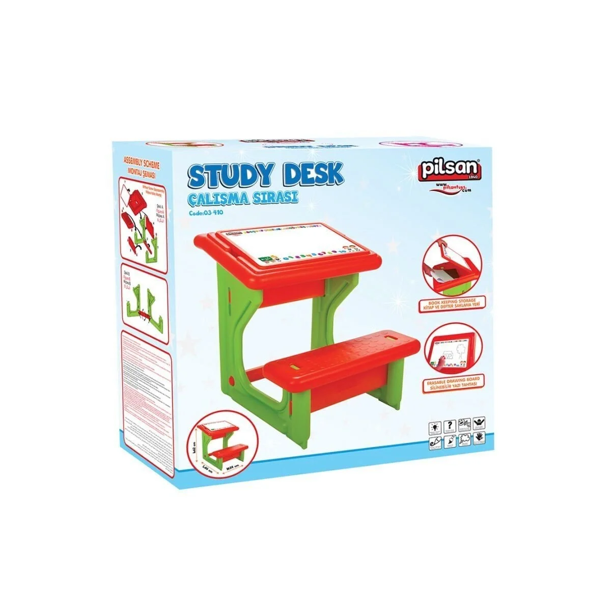 Kullanım yaşı 36+ ay Max. taşıma kapasitesi 35 Kg. Silinebilir tahta Kitap ve defter saklama yeri Ergonomik dizayn Kolay kurulum Kanserojen madde içermeyen çocuk sağlığına uygun ham madde Ürün ölçüleri: W:54 L:66 H:62 Cm Ambalajlı ürün ölçüleri: W:23 L:55 H:55,50 Cm