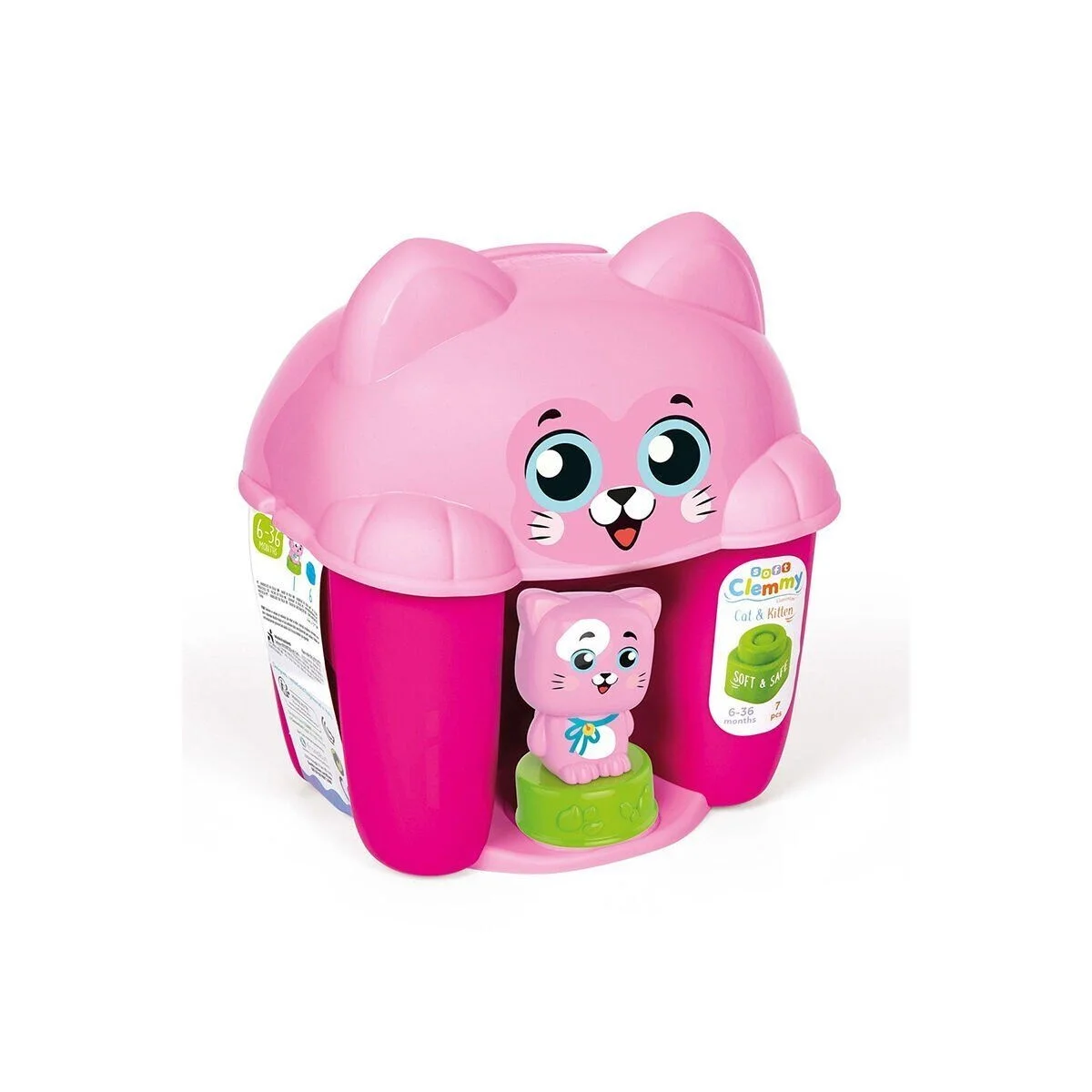 -Bu özel kedi şeklindeki kova, en küçük çocuklarınızın tamamen güvenli bir şekilde oynayabilmesi için tasarlanmış 6 adet Clemmy yumuşak yapı bloğu içerir. -Bir Clemmy karakteri içerir: fantastik hikayeler hayal edebileceğiniz süper sevimli bir kedi yavrusu. -Yumuşak Clemmy yapı blokları, duyusal keşfi teşvik etmek, el becerisini ve fiziksel koordinasyonu canlandırmak için idealdir.