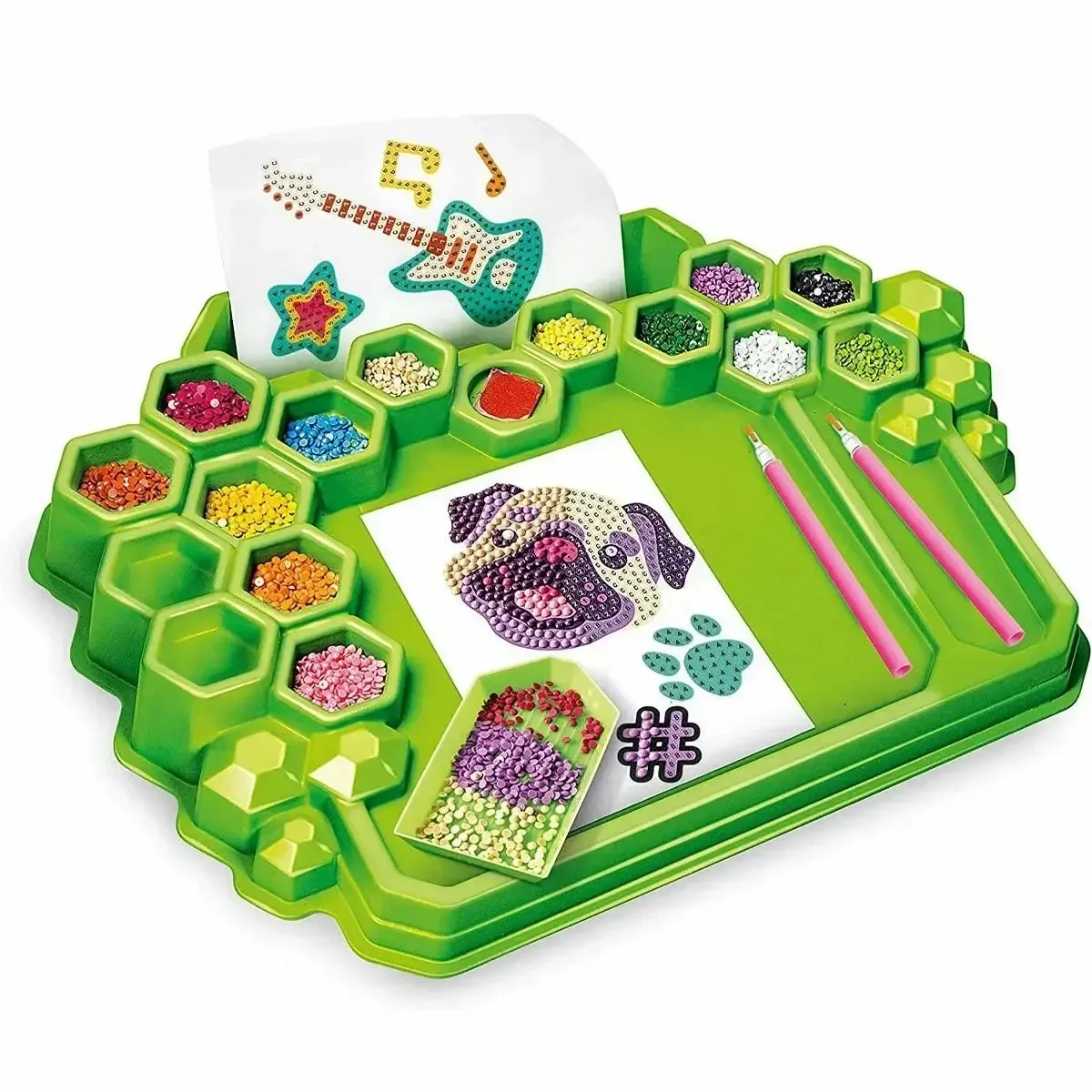 • Çalışma istasyonunuzu oluşturup alanınızı ayarlamak ve işe koyulmak için gereken her şey kutunun içinde! Kağıtlar, araçlar ve renklerine göre ayrılan suni elmaslar çalışma istasyonuna sığabiliyor.
