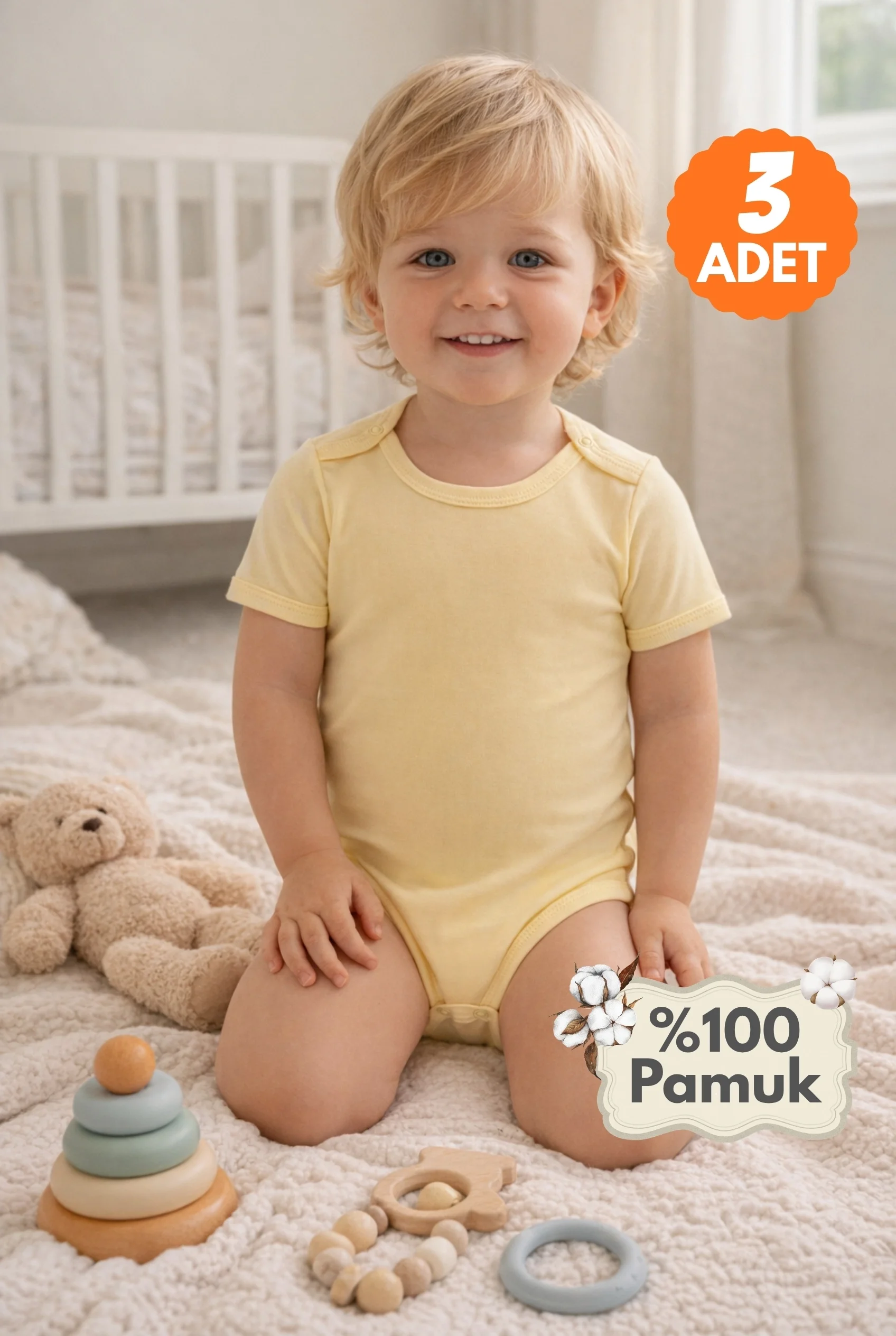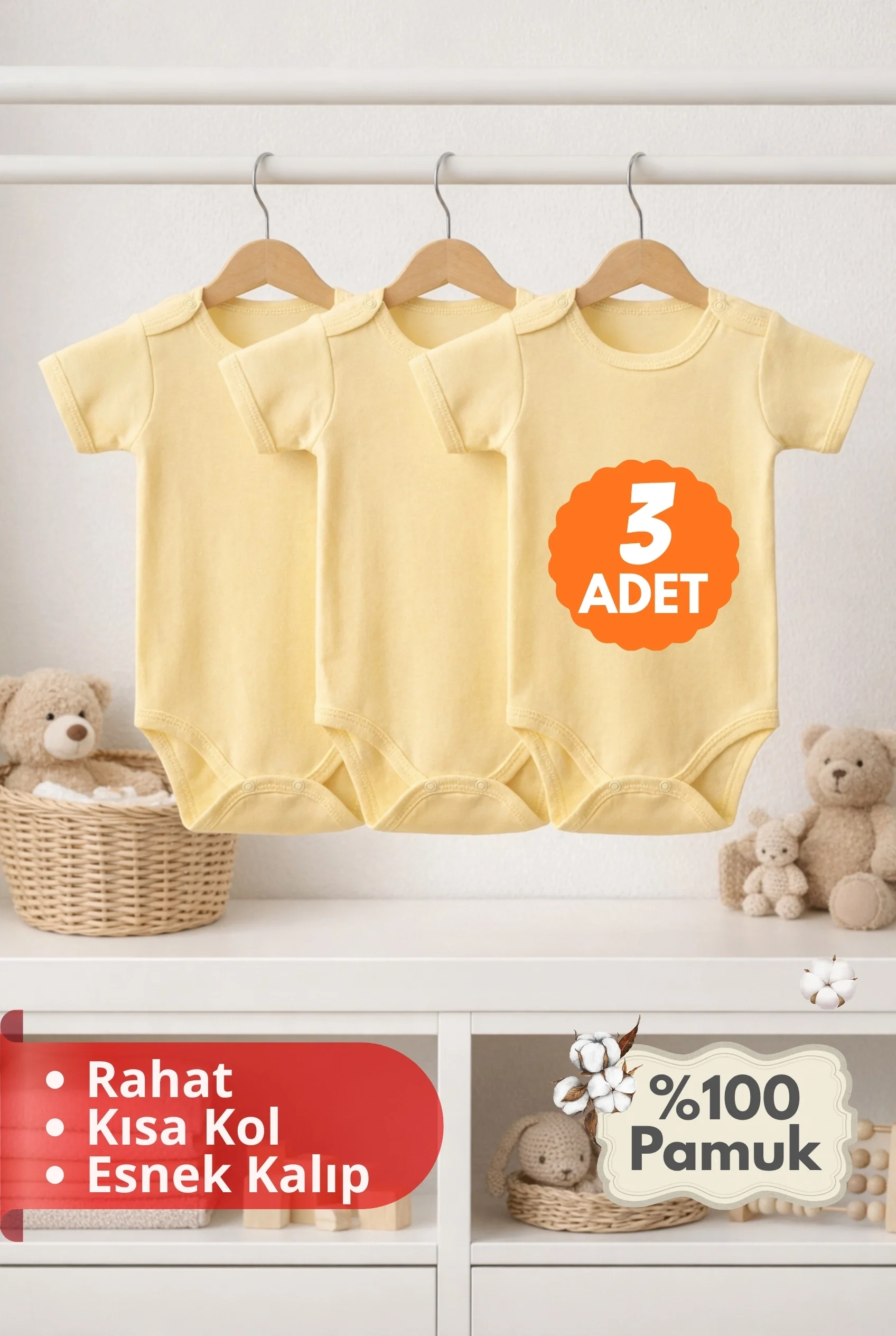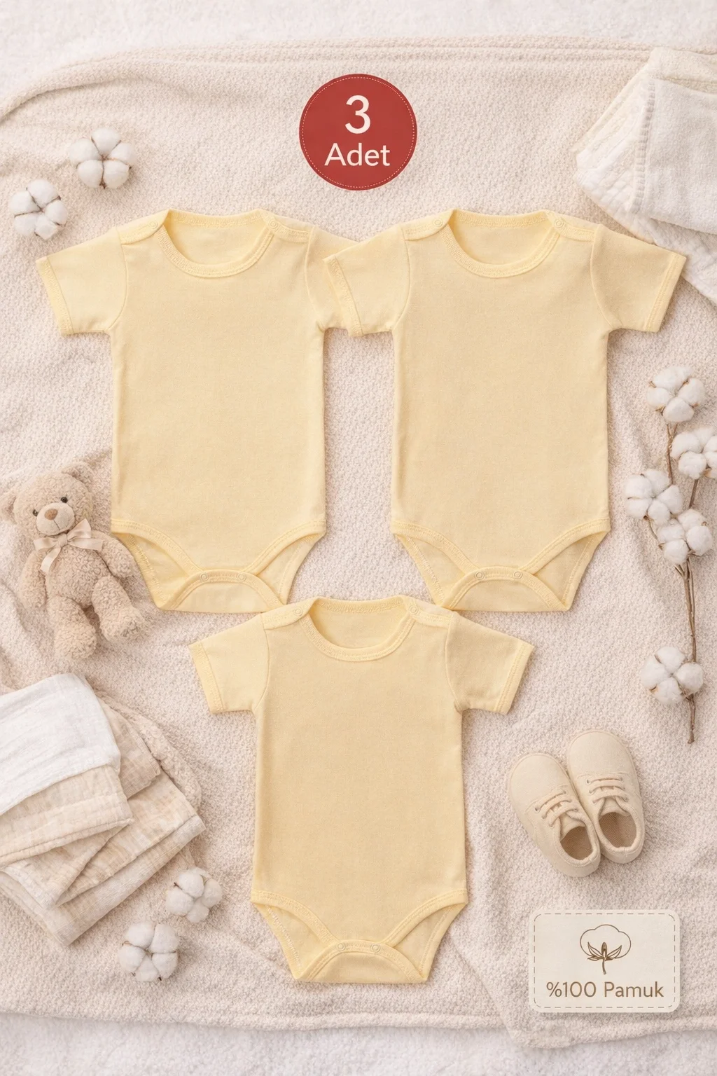 2-12 Yaş 3'lü Sarı Bebek Çocuk Body %100 Pamuk Esnek Kalıp Kısa Kol Çıtçıtlı Zıbın
