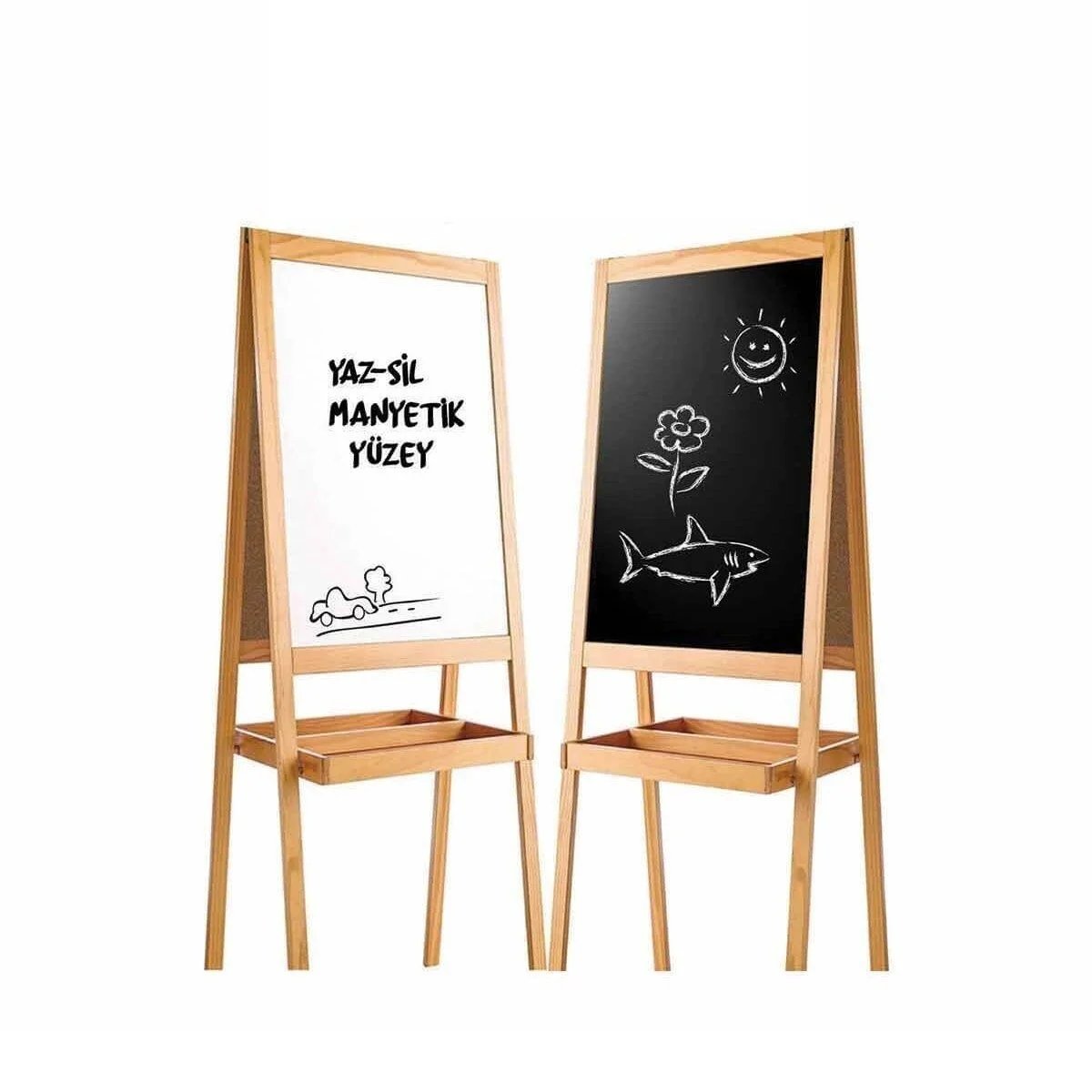 Ahşap Yazı Tahtası Çift Taraflı Manyetik 1 yazı tahtası ve 2 farklı kullanım! İster ön yüzüne renkli tebeşirler ile yazılar yazın, okuldaki derslerinizi çalışın isterseniz de tahtanın arka yüzündeki mıknatıslı kısmına markör kalem ile dilediğiniz resmi çizin! Kutu içerisinde bulunan silgi ile de yazdıklarınızı kolayca temizleyebilirsiniz. Kutu içerisinde; çift taraflı ayaklı yazı tahtası, tebeşir, silgi ve 1 adet markör yer almaktadır. Yazı tahtası ile çocukların; yaratıcılıklarını teşvik etmek özgüvenlerini güçlendirir. İstedikleri gibi yazarlar, çizerler ve yazı yazmanın tadını çıkartırlar. Hayal gücünün gelişimine faydalıdır. Organizasyon yeteneğini geliştirir. El ve göz koordinasyonunu sağlar. Algılama ve kavrama yeteneğini güçlendirir. Konsantrasyon, zeka ve fiziksel gelişime katkı sağlamaktadır. Yazı tahtası ahşap kaliteli malzemeden üretilmiştir, uzun yıllar kullanım kolaylığı sağlamaktadır. Ürün ölçüsü: 45 x 42 x 110 cm. Kutu ölçüsü: 48 x 7 x 109 cm.