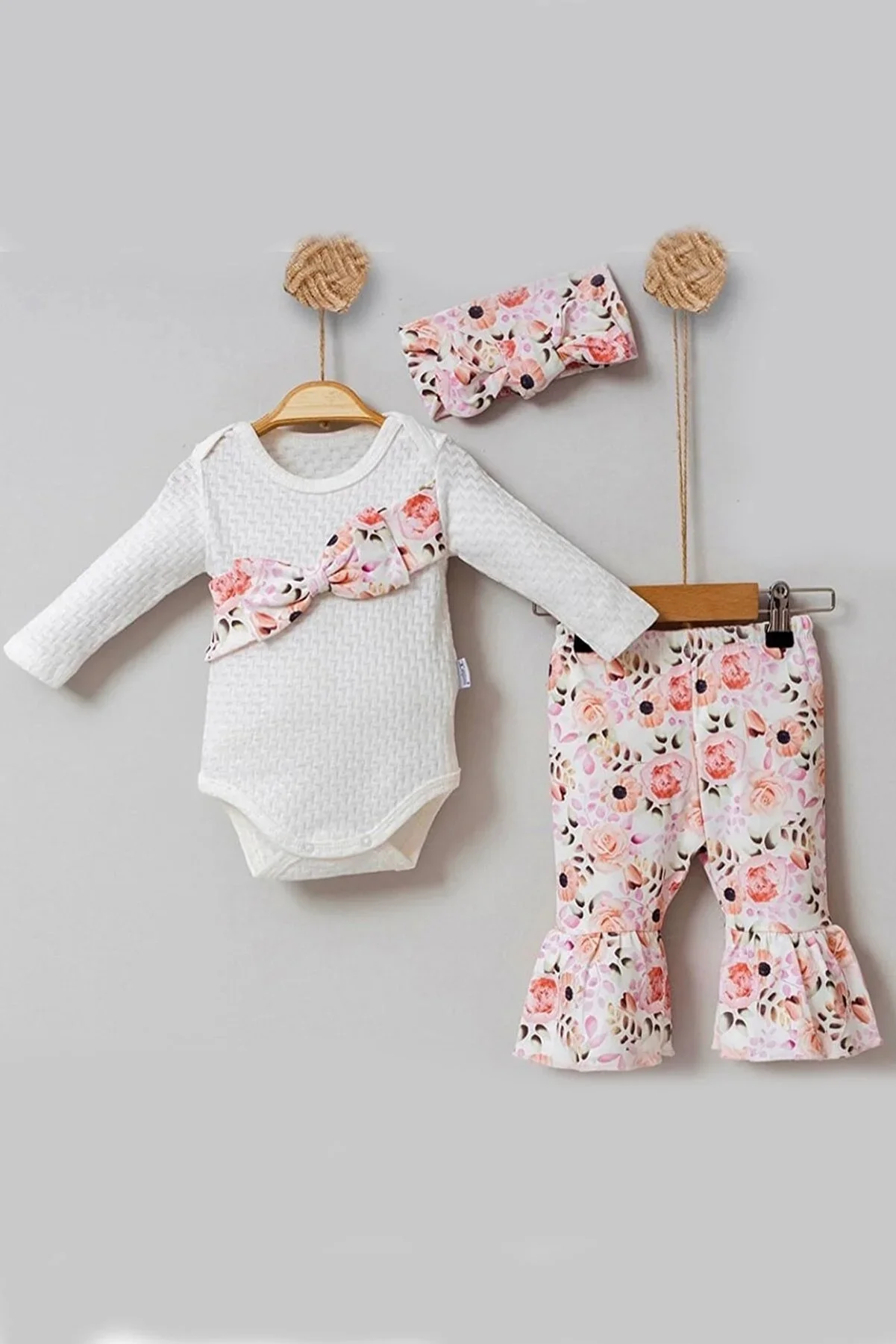 3-6-9-12 Ay Kız Bebek Takım Çiçek Desenli Fiyonklu 3'lü Krem