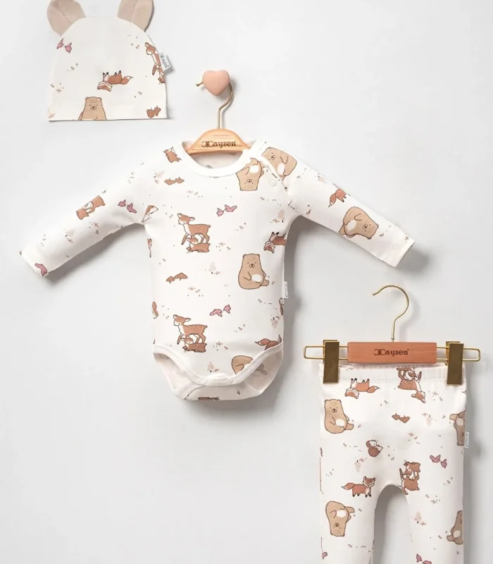 Karaca desenli ve şapkalı bu 3’lü takım, 3-6-9-12-18 aylık erkek bebekler için ideal bir seçimdir. Krem rengi ve %100 pamuklu yapısı sayesinde, bebeğinizin cildine zarar vermeden gün boyu konfor sağlar. Şirin ve rahat bir tasarım arayan ebeveynler için mükemmel.