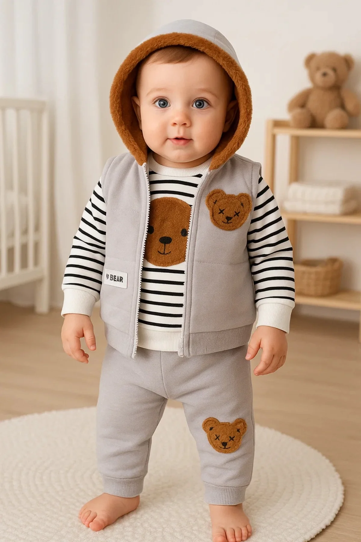 Gri renkte %100 pamuklu peluş ayıcık desenli kapişonlu üç parçalı erkek bebek takımı. 3-18 aylık bebekler için uygundur. Yumuşak ve konforlu yapısı ile bebek cildine zarar vermez. Günlük kullanım için idealdir.