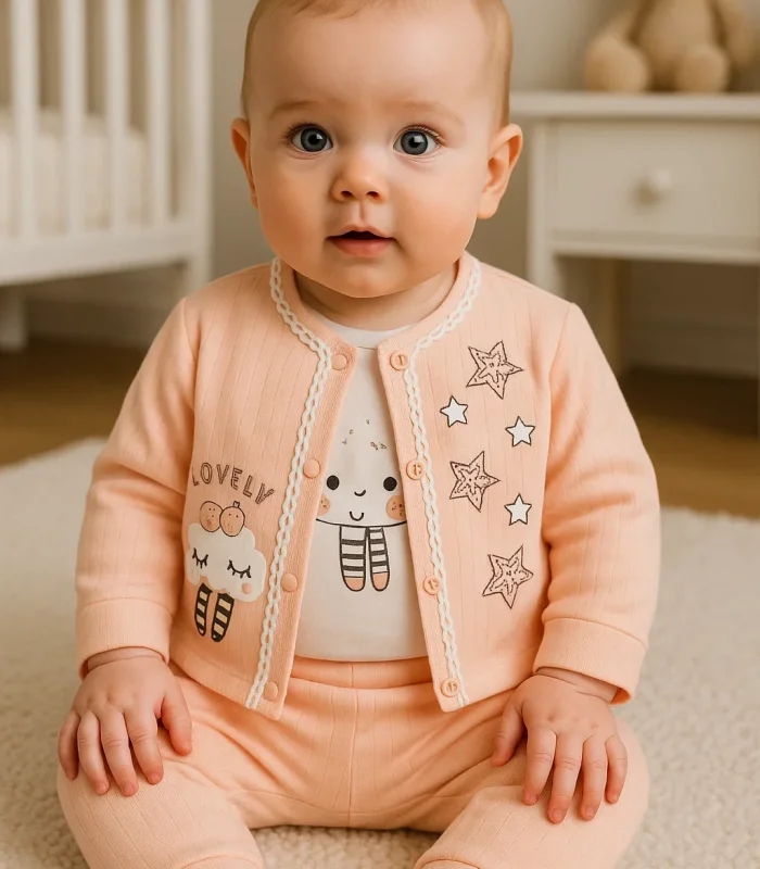 3-6-9 Ay Kız Bebek Takım Lovely Yıldız Desenli 3'lü Hırkalı Somon Somon renkli lovely yıldız desenli hırka seti, 3-6-9 ay arası kız bebekler için idealdir. Üç parçalı bu takım, yumuşak ve kaliteli kumaşı ile bebeğinizin cildine zarar vermez. Yıldız desenleri ve lovely yazıları ile bezeli bu set, bebeğinize şirin ve zarif bir görünüm kazandırır.