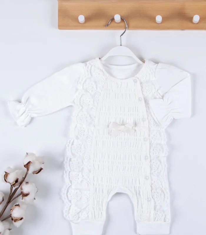 3-6-9 Ay Kız Bebek Tulumu Gofralı Fransız Güpürlü %100 Pamuk Beyaz Beyazın saf dokunuşu ve Fransız güpürlerinin zarafeti, bu tulumda kusursuz bir şekilde birleşiyor. %100 pamuk kullanılarak, yalnızca konfor değil, aynı zamanda dayanıklılık da sağlanmıştır. Her türlü özel etkinlik için zarif bir seçim.