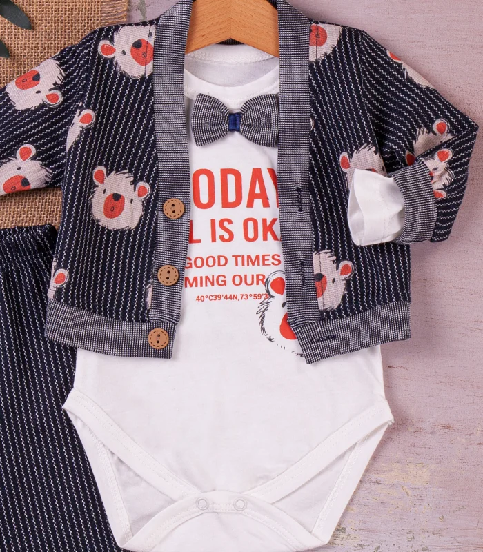 3-6-9 Ay Erkek Bebek Takımı Papyonlu Bear Çizgili Model Ceketli 3'lü Siyah Siyah renkli papyonlu Bear çizgili model ceketli erkek bebek takımı, 3-6-9 ay arası bebekler için uygundur. Üç parçadan oluşan bu takımın kaliteli kumaşı, bebeğinizin cildine zarar vermez ve konfor sağlar. Şık papyon ve çizgili ceket tasarımı ile bebeğinize zarif bir görünüm kazandırır.