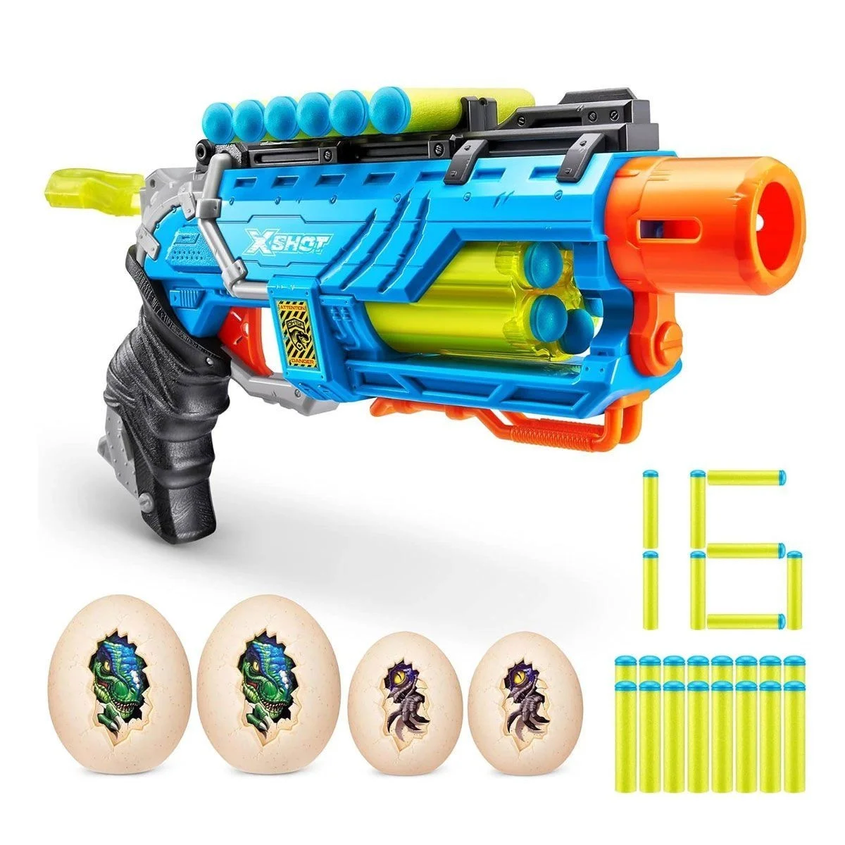 X-Shot Dino Attack Dino Striker ile vuruşa hazır olun! Dino yumurtalarını 27 m / 90 feet'e kadar uzaklıktan aşırı doğrulukla yok edin. Otomatik dönen 6 dart namlusu ve üstündeki ek 6 dart saklama alanı ile her zaman vuruşa hazır olacaksınız. Dino yumurtalarınızı hedef alıştırması için kullanın ve yumurtadan çıkmadan önce hepsini patlatın! Dino Striker ile hiçbir Dino'nun şansı yok!