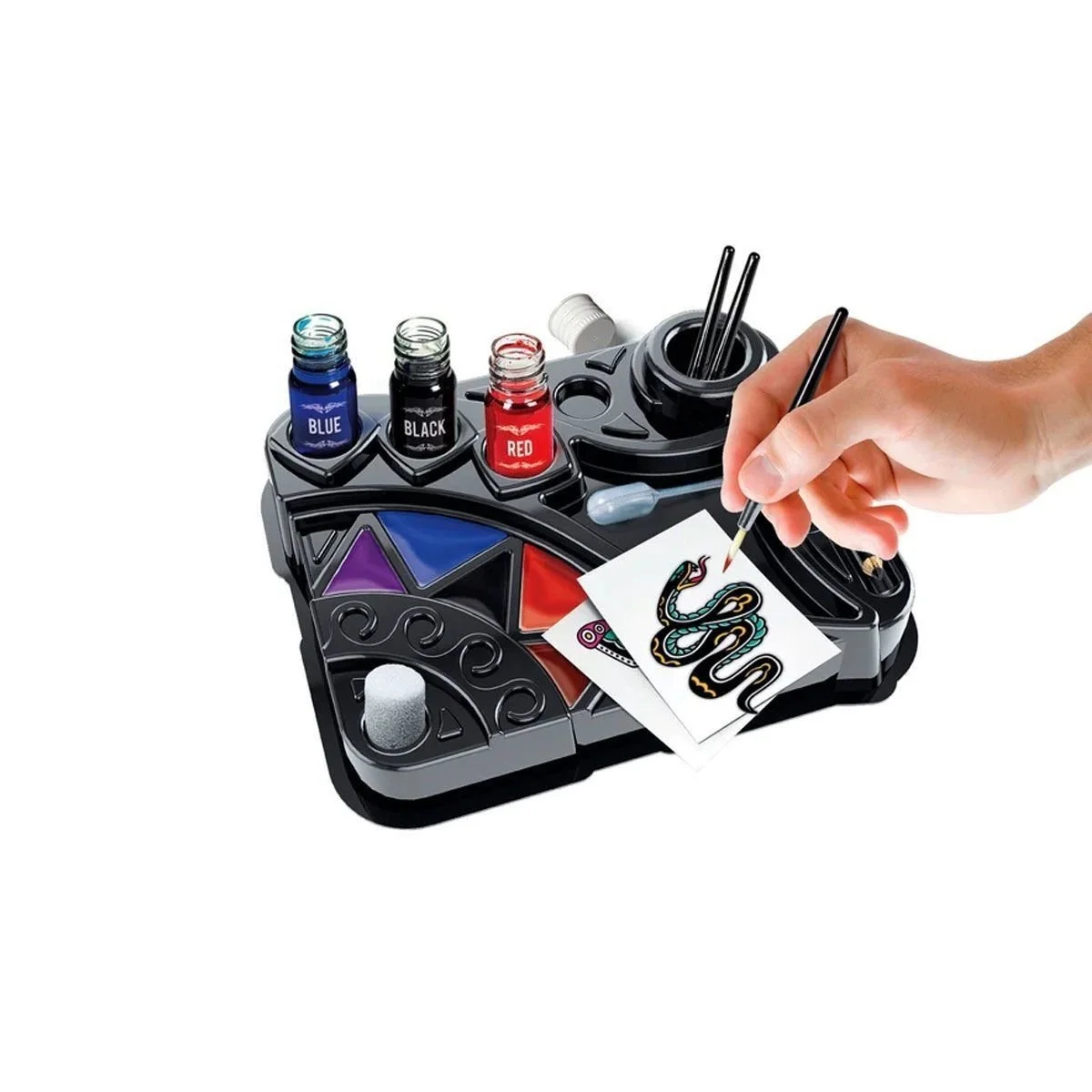 Set, gerçek bir dövme sanatçısı gibi serbest dövmeler yapmak için bir çalışma tezgahı, keçeli kalemler, renklendirici sıvılar ve şablonlar içerir!
