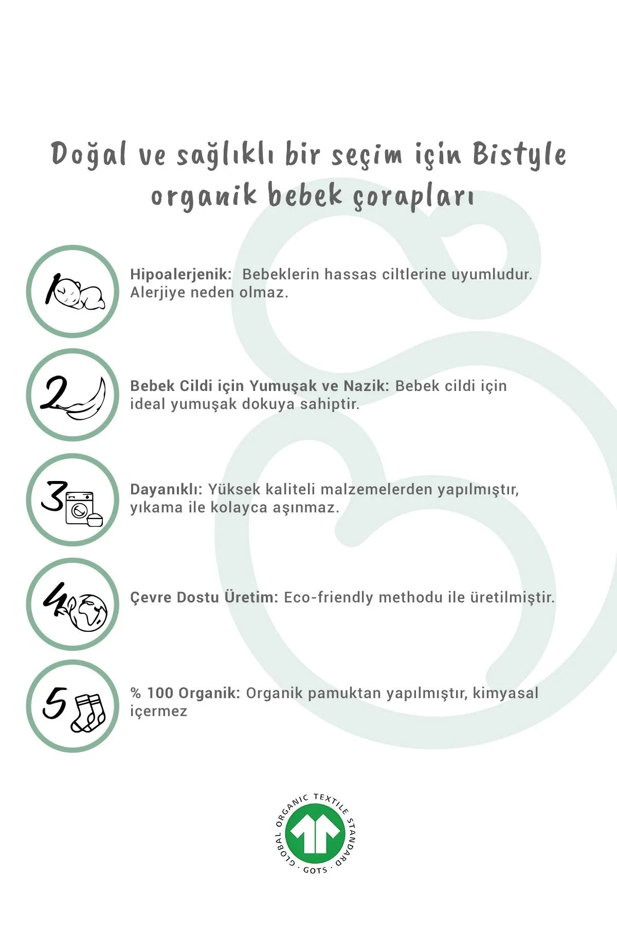 Bistil Kız Erkek Bebek Basic Bebek Bebe Soket Uzun Çorap Bebek Çorap Bebek Çorabı Bebe Çocuk Corap Renkli Kokulu Pamuklu Yumuşak Antialerjik Paket İçeriği: Bistil Bistyle Organik Dikişsiz 2li Figürlü Kaymaz Penye Soket Bebek Çorap Yumuşak, nefes alabilir, nem emici ve kokulu Bistil çoraplarımız minik bebekleriniz için özenle üretilmiştir. Bebeğinizin ayak parmaklarını her türlü havada, güvende tutar, yumuşacık ve konforlu tasarıma sahiptir. Birinci sınıf ince pamuklu malzeme, rahatlık ve nefes alma özelliği ile bebeğinize daha konforlu bir deneyim kazandırır. Bebeğinizin sağlığını ve mutluluğunu ilke edinen Bistil ürünleri, bebeğinizin hassas cildini tahriş eden veya alerjen oluşturacak herhangi bir kimyasal özellik barındırmamaktadır. Kumaş Türü: % 80 Organic Pamuk / Cotton - % 17 Recycled Pre Comsumer Polyamide - % 3 Elastane Yıkama Tavsiyesi: Ürünlerimizi daha uzun süre kullanabilmeniz için ağartıcı deterjan kullanmamanız önerilir. 30 derecede yıkama önerilmektedir. Üretim Yeri: TÜRKİYE