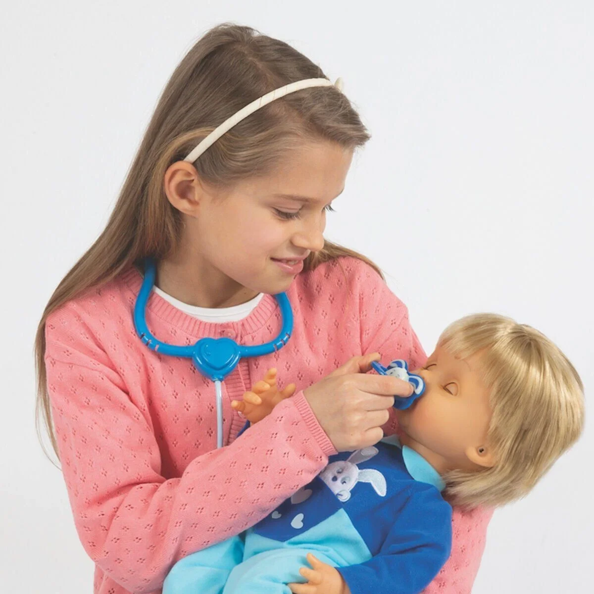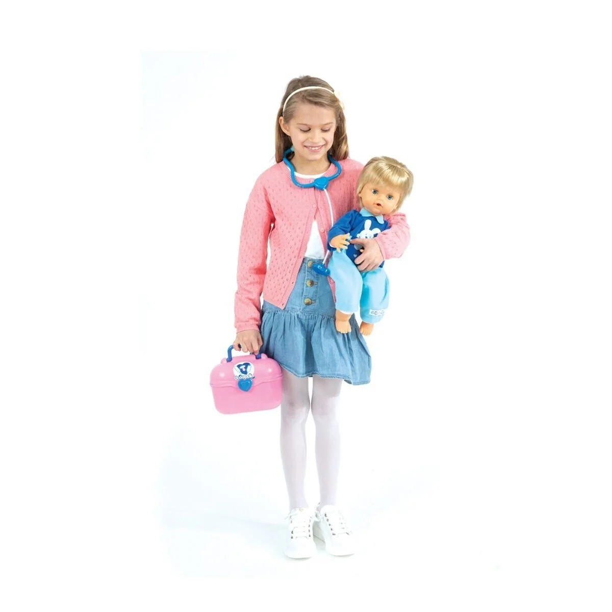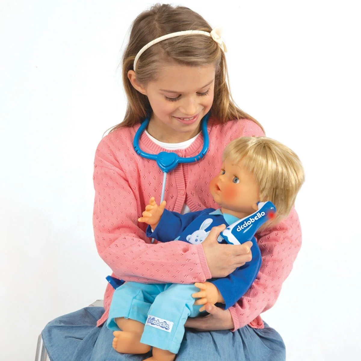 Kullanım şekli:Cicciobello bebek, kutudan tulumu giyili halde çıkarılıyor ve düz bir zemin üzerine yatırılarak oyuna hazırlanıyor. Bebek, dahili ses modülü sayesinde belirli aralıklarla hasta sesleri ve öksürük efektleri çıkarıyor. Bu sesler, bakım temalı rol oyununu başlatmak için kullanılıyor. Termometre, bebeğin koltuk altına veya ağzına tutuluyor ve LED ışığı yanarak ölçüm yapıldığı hissi veriliyor. Stetoskop, kalp atışı dinleme oyunu için kullanılıyor. Enjektör ile ilaç verme oyunu canlandırılıyor; şeffaf tüpü sayesinde gerçekçi bir görünüm sunuluyor. Farklı renkteki ilaç şişeleriyle tedavi süreci tamamlanıyor. Uyku zamanı geldiğinde tavşan şeklindeki emzik bebeğe takılıyor ve karanlıkta hafifçe parlayan yapısıyla gece oyunlarına eşlik ediyor. Oyuncak mendil kutusu ile bakım aşaması destekleniyor. Tüm aksesuarlar oyun sonunda taşıma çantasına yerleştiriliyor ve ürün kolayca taşınabiliyor.