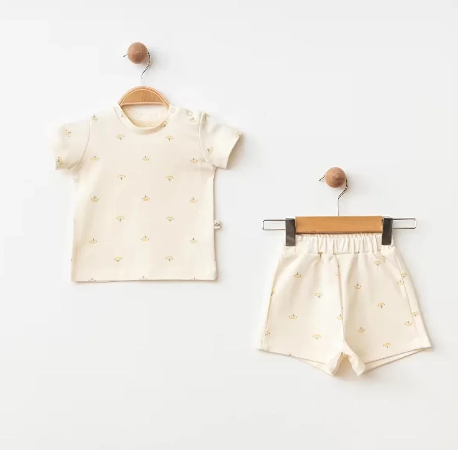 Bebeğinizin rahatlaması ve şıklığı için tasarlanan bu organik 2'li takım, hem konforlu hem de zarif bir seçenek sunuyor. Ekru rengindeki şort ve tişörtü, sevimli lotus desenleriyle bezenmiş olup, dost organik kumaşı ile yumuşacık ve nefes alabilen bir yapı sunar. Kısa kollu tasarımı, rahat kesimi ve esnek bel kısmı sayesinde hareket özgürlüğünü kısıtlamaz, ve konfor sağlar. Malzeme: %100 pamuklu yumuşak kumaş, hassas ciltler için idealdir. Rahat ve esnek: Yumuşak dokusu sayesinde bebeğinizin hareket özgürlüğü kısıtlanmaz, gün boyu rahat hissetmesini sağlar.