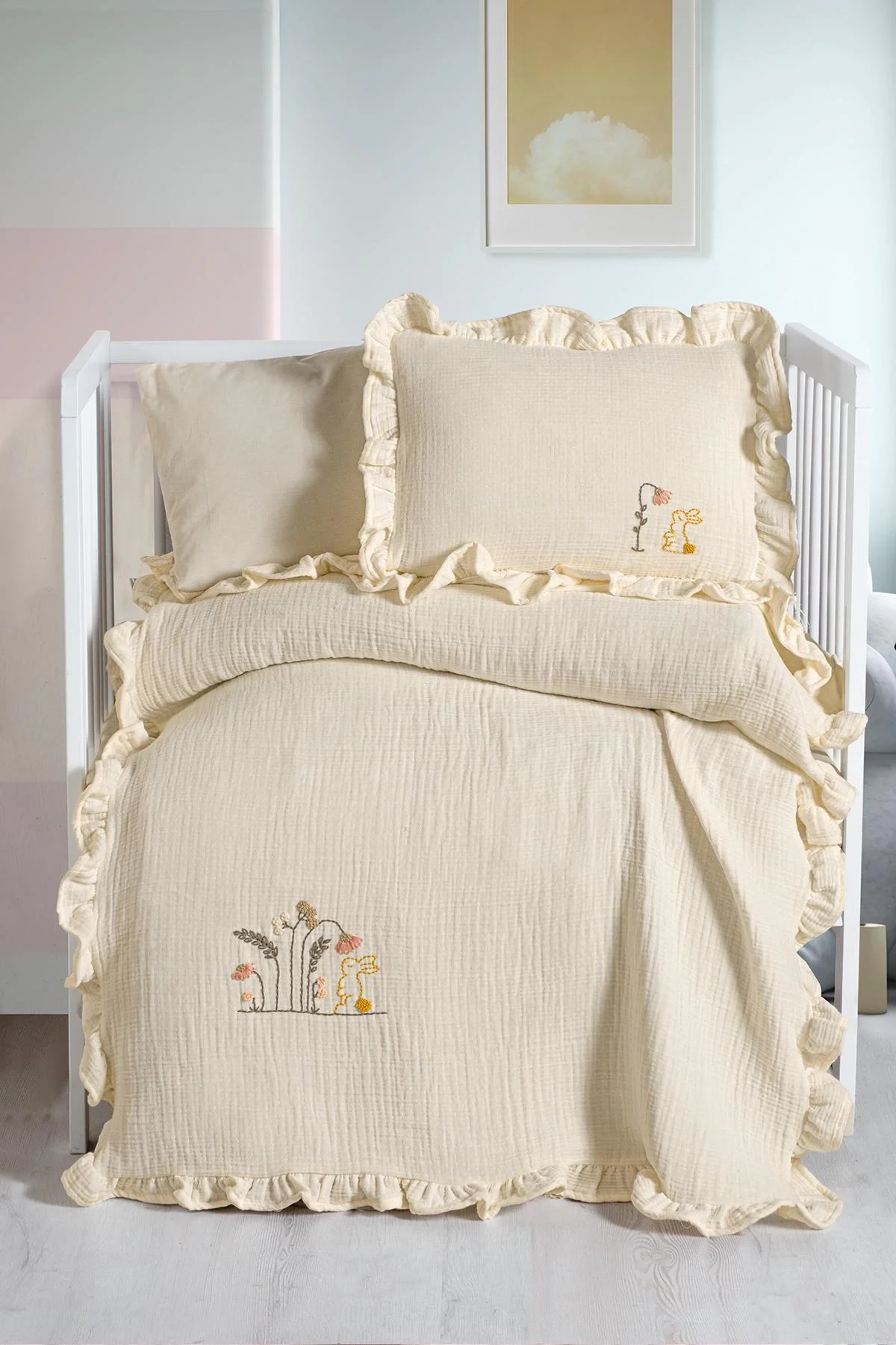 OEKO-TEX sertifikalı %100 pamuk kumaştan üretilen set; yumuşak dokusu, nefes alabilir yapısı ve el işçiliğiyle öne çıkan fırfırlı detaylarıyla bebeğiniz için hem şık hem fonksiyonel bir uyku deneyimi sunar.