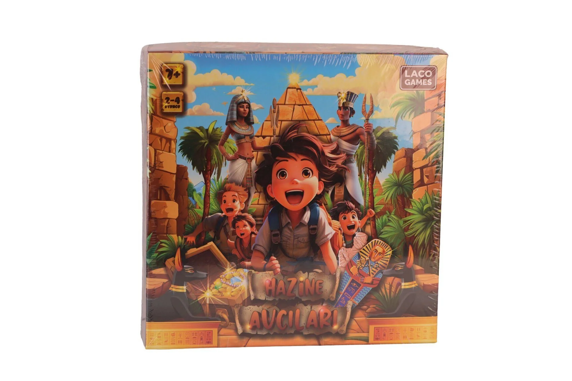 HAZİNE AVCILARI - İçindekiler: 1 adet üçgen piramit 3 adet oyun alanı 4 adet figür 2 adet merdiven 1 adet sandık 16 adet engel kartı 14 adet hazine anahtarı kartı 1 adet çark 1 adet kılavuz Kutu ölçüsü: 28x28x5 cm