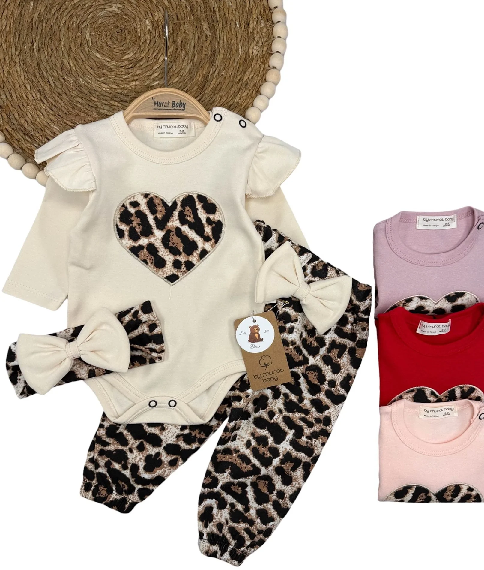Şıklık ve rahatlığı bir araya getiren Leopar Desenli Kalp Detaylı 2’li Kız Bebek Takımı, minik prensesler için özel olarak tasarlandı. Modern leopar deseni ve zarif kalp figürüyle dikkat çeken bu takım, günlük kullanımda hem konfor hem de stil sunar.