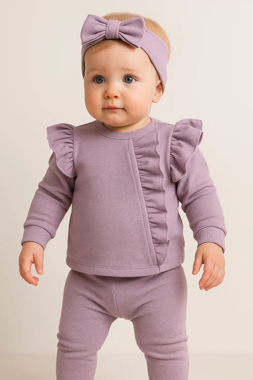 Orkide Büzgü Detaylı 3 Parça Kız Bebek Takımı %100 Pamuk