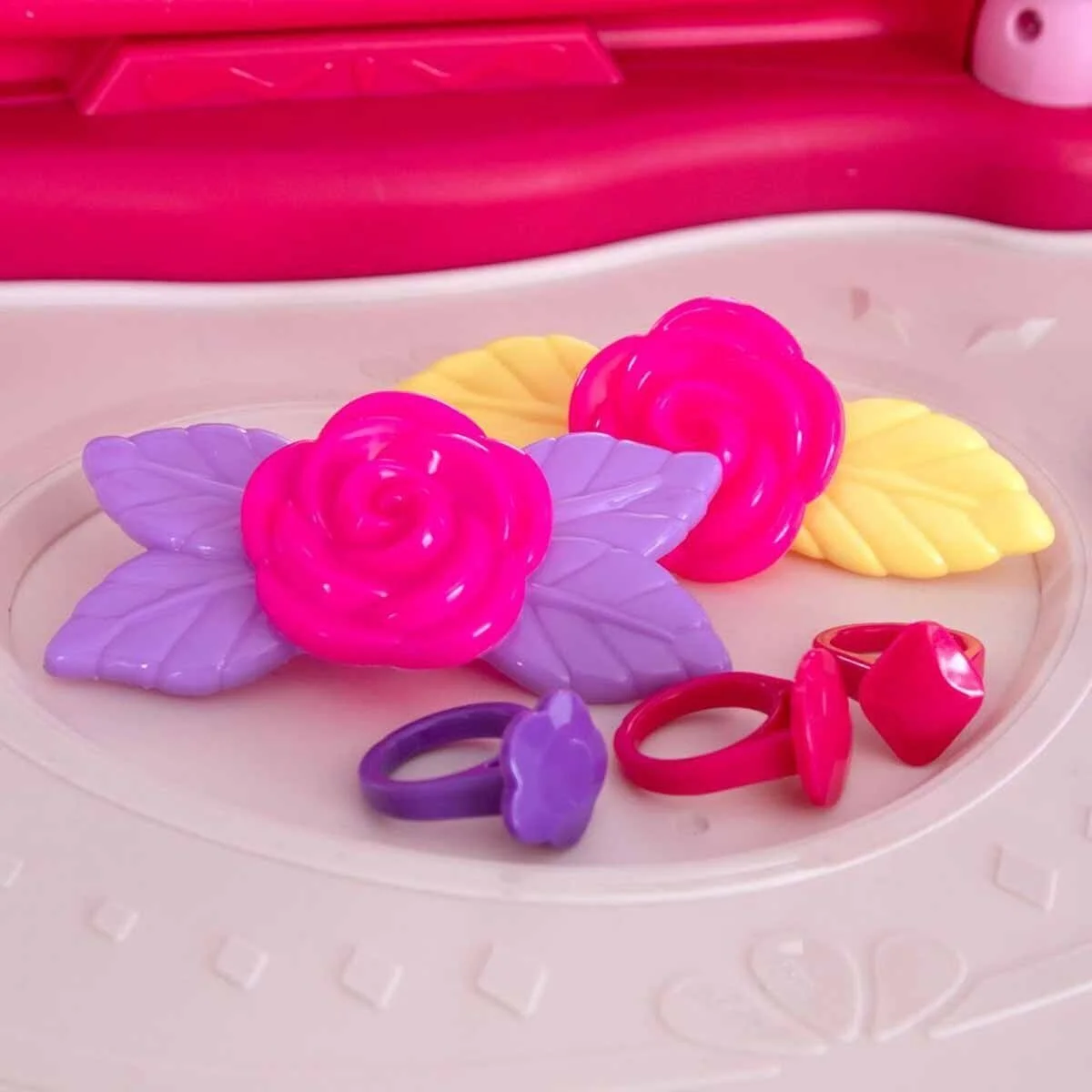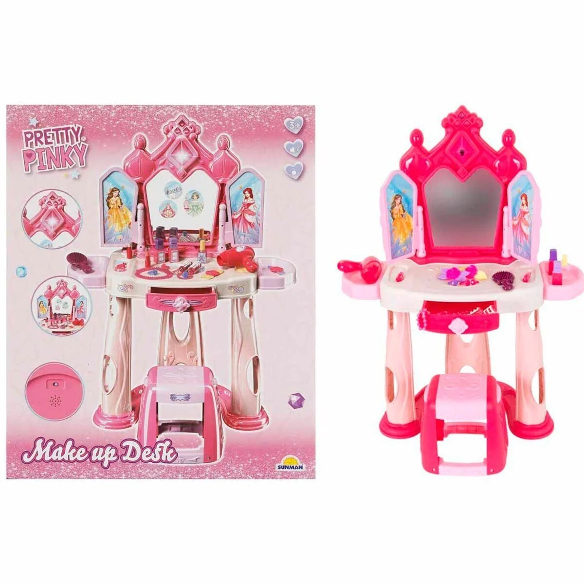 Pretty Pinky Işıklı ve Sesli Makyaj Masası Oyun Seti ile kızlar makyajını yapıyor, saçlarını tarıyor, ojelerini sürüyor ve büyülü masalların dünyasına yolculuk etmek için hazır oluyor. Kendi dünyasının prensesi olarak zarafeti, cesareti ve güzelliği ile krallığını yöneten kızlar, yaratıcı oyunlar oynayarak eğlenceli vakit geçiriyor. Prensesler, aynanın karşısına geçip annesinin güzellik ritüellerini mutlu bir şekilde taklit ediyor.