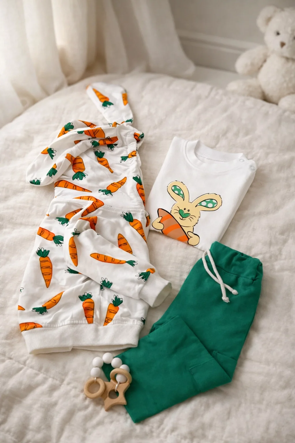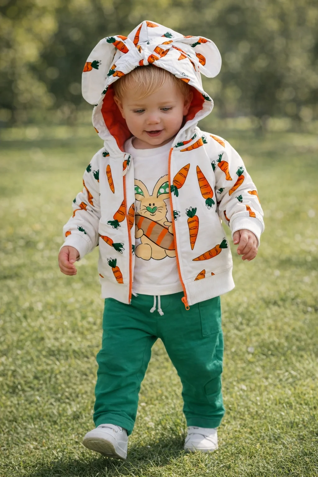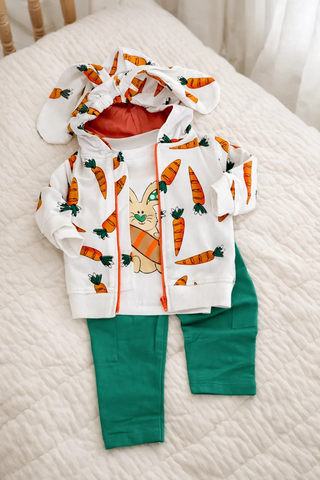 Sevimli tasarımı ve konforlu yapısıyla öne çıkan Tavşan ve Havuçlar temalı 3’lü bebek takımı, bebeğinizin hem şık hem de rahat hissetmesini sağlar. Günlük kullanım için ideal olan bu takım; kapüşonlu fermuarlı üst, baskılı tişört ve yumuşak dokulu pantolondan oluşur. Hem kız hem erkek bebekler için unisex tasarımı sayesinde tercih edilebilir.